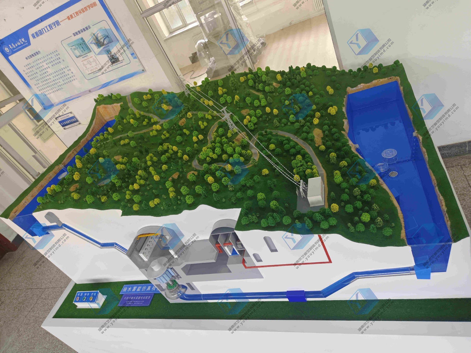 抽水蓄能水電站動態剖面結構仿真模型, 是湖南省優藝模型研發 、設計、制作的仿真教學實訓設備, 設備長 4米 寬1.2米。整體采用空面結構展示, 展示出上水位、 地下廠房、水輪發電機、下水位、 地面部分制作出山體地形綠化、鐵塔電能輸送線路等。 設備整體采用真實過水、 模擬進水管道、 渦殼尾水管等采用透明結構, 內部真實過水 和LED燈光動態模擬水流流向 、通過自控技術實現抽水原理演示、 發電原理演示、 實現水輪機正反轉、水流反向流動 、實現 抽水蓄能水電站工作原理動態演示。 適用于教學實訓科普展覽等